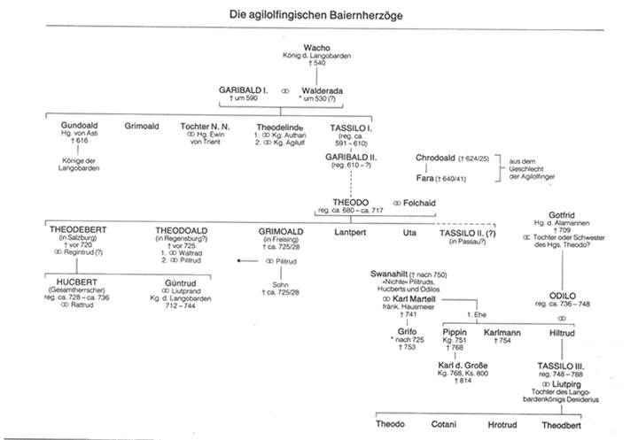 Bayernherzog Tassilo III. aus dem Geschlecht der Agilolfinger, der Vorfahren der Babenberger (650-718), dem Geschlecht der Stammesherzöge Baierns | ||||||||||||||||||||||||||||||||||||||||||||||||||||||||||||||||||||||||||||||||||||||||||||||||||||||